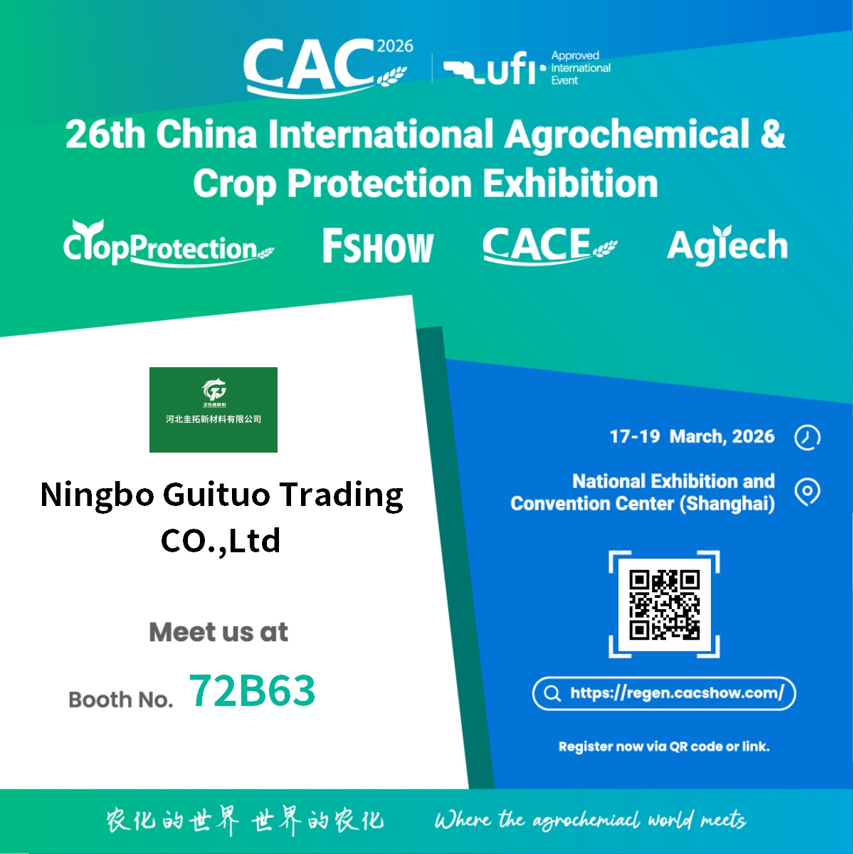 Ningbo Guituo เทรดดิ้ง จำกัด มีความภูมิใจที่จะประกาศการมีส่วนร่วมใน นิทรรศการเคมีเกษตรและอารักขาพืชนานาชาติของจีนครั้งที่ 26 (CAC 2026) . งานระดับโลกอันทรงเกียรตินี้จะจัดขึ้นตั้งแต่ วันที่ 17 ถึง 19 มีนาคม 2569 ที่ศูนย์นิทรรศการและการประชุมแห่งชาติในเซี่ยงไฮ้
